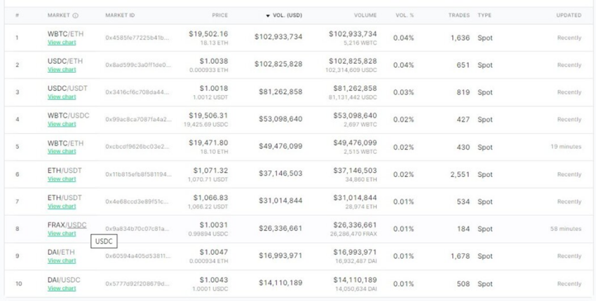 Dari 10 pasar teratas di platform tersebut, tujuh di antaranya datang dari pasangan stablecoin. Nama-nama yang tercantum di daftar tersebut di antaranya yaitu USDC/ETH, ETH/USDT, USDC/USDT, WBTC/USDC, ETH/USDT, FRAX/USDC, dan DAI/USDC.