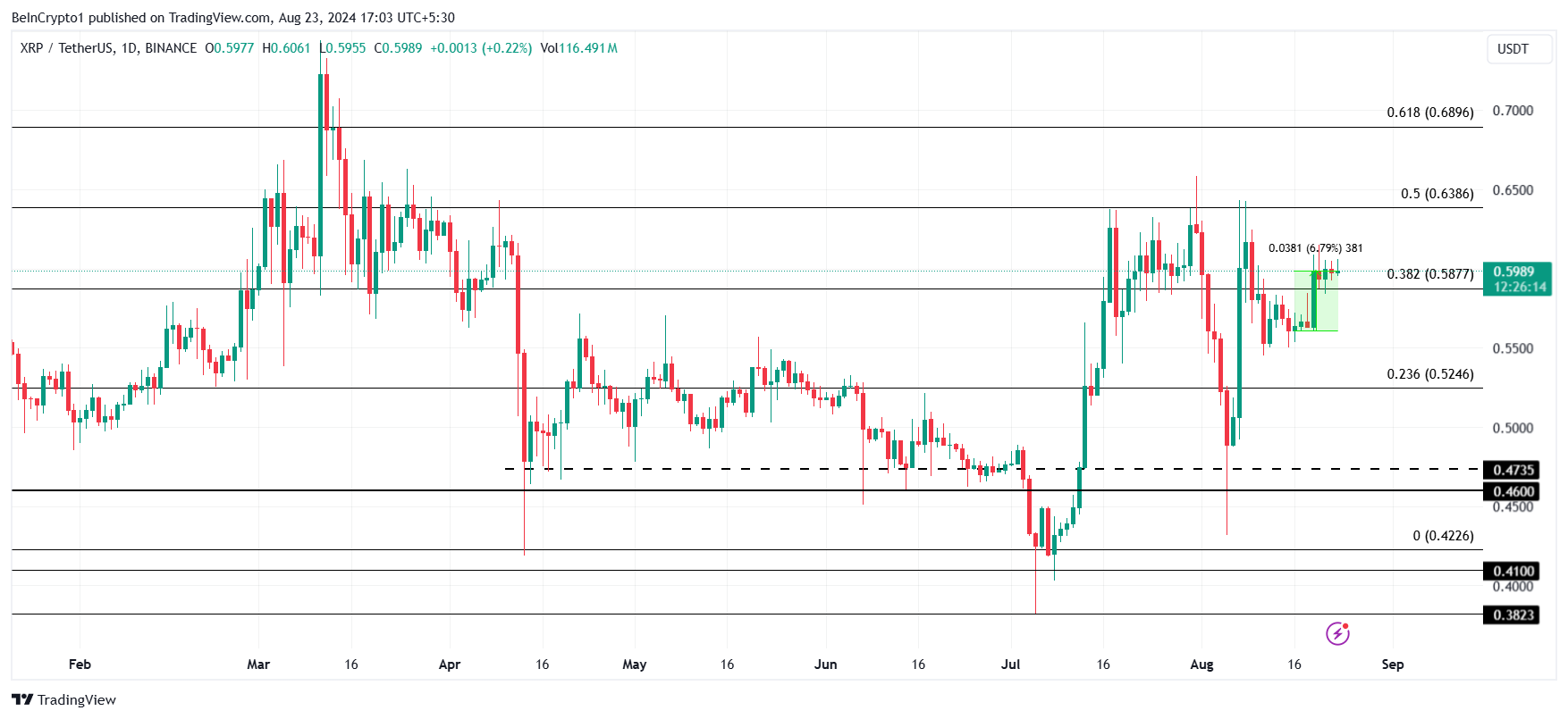 Harga XRP mencatat minggu yang lebih baik dibandingkan dengan ETH dan BTC. Altcoin ini telah menanjak sebesar 6,7% dan sekarang bertengger di level US$0,59, berhasil ditutup di atas level Fibonacci Retracement 38,2%. Native token Ripple ini sekarang berusaha untuk menerobos garis Fib 50%.