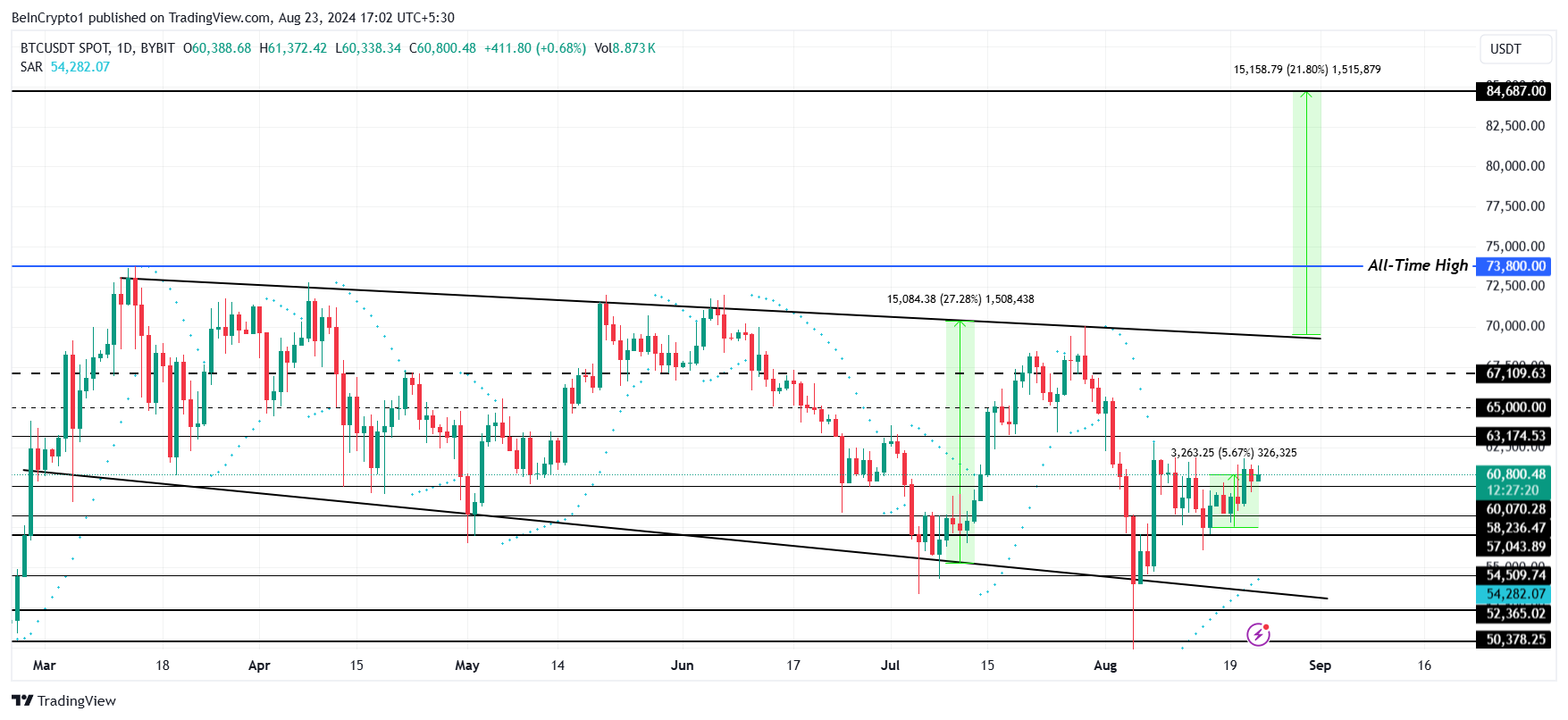 Harga Bitcoin mengalami minggu yang cukup positif daripada minggu sebelumnya, naik 5% lebih. Saat ini diperdagangkan di US$60.800, BTC masih bertahan di dalam pola bullish descending broadening.