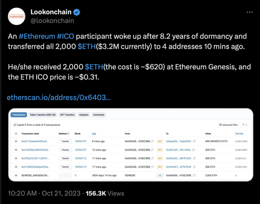 Menurut pelacak blockchain Lookonchain, alamat whale ini merupakan partisipan dalam genesis Ethereum menerima 2.000 ETH lebih dari 8 tahun yang lalu. Ketika itu, harga aset ini hanya dibanderol US$0,31. Namun yang mengejutkan, pada hari Sabtu (21/10), koin-koin ini berpindah wallet untuk pertama kalinya.