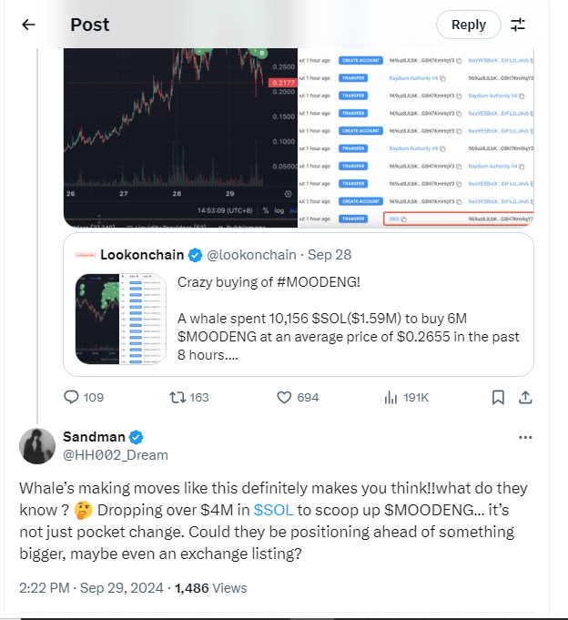 Laporan Lookonchain mengungkap, pembelian terbaru terjadi pada 29 September. Whale tersebut menarik 2.000 token Solana (SOL) dari OKX yang setara dengan US$311 ribu. Dana hasil penjualan SOL digunakan untuk memborong MOODENG.