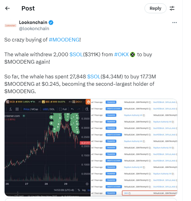 “Sejauh ini, whale tersebut telah menghabiskan 27.848 SOL atau setara dengan US$4,34 juta untuk membeli 17,73 juta MOODENG di harga US$0,245,” jelas laporan.