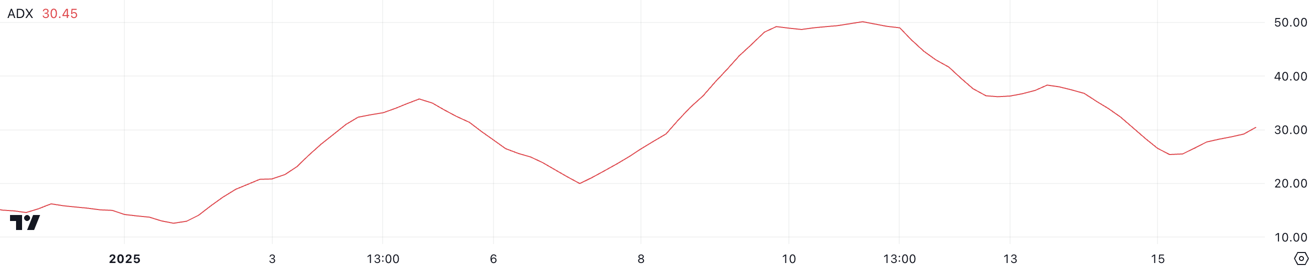 ADX mengukur kekuatan tren pada skala dari 0 hingga 100, tanpa menunjukkan arahnya. Nilai di bawah 20 menunjukkan pasar yang lemah atau terikat dalam rentang, sementara nilai di atas 25 menunjukkan tren yang kuat.