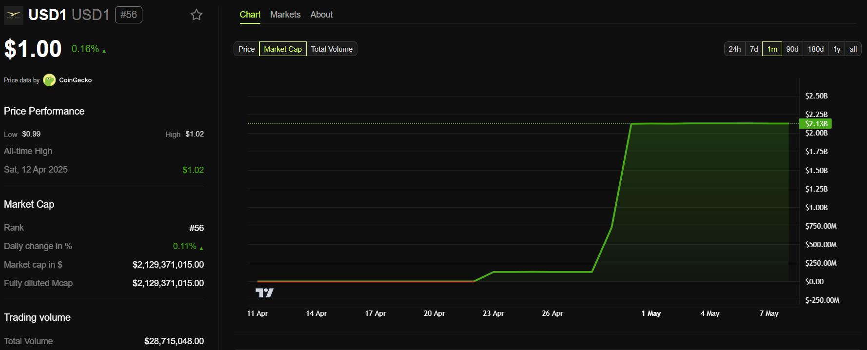 Selain itu, data dari BeInCrypto menunjukkan bahwa USD1 mengalami pertumbuhan pesat dalam waktu singkat. Pada 28 April, kapitalisasi pasarnya mencapai US$128 juta. Pada hari berikutnya, kapitalisasi tersebut melonjak menjadi lebih dari US$2 miliar.