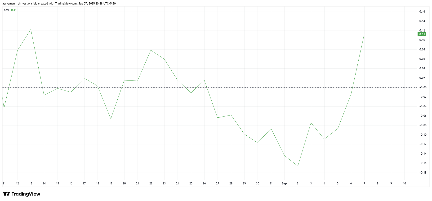 Aktivitas on-chain juga mendukung momentum lebih luas Worldcoin. Indikator Chaikin Money Flow (CMF) mencatat lonjakan tajam dalam sesi terbaru, menunjukkan aliran masuk yang kuat ke dalam aset kripto ini. CMF positif menandakan permintaan berkelanjutan yang dapat memperpanjang reli.
