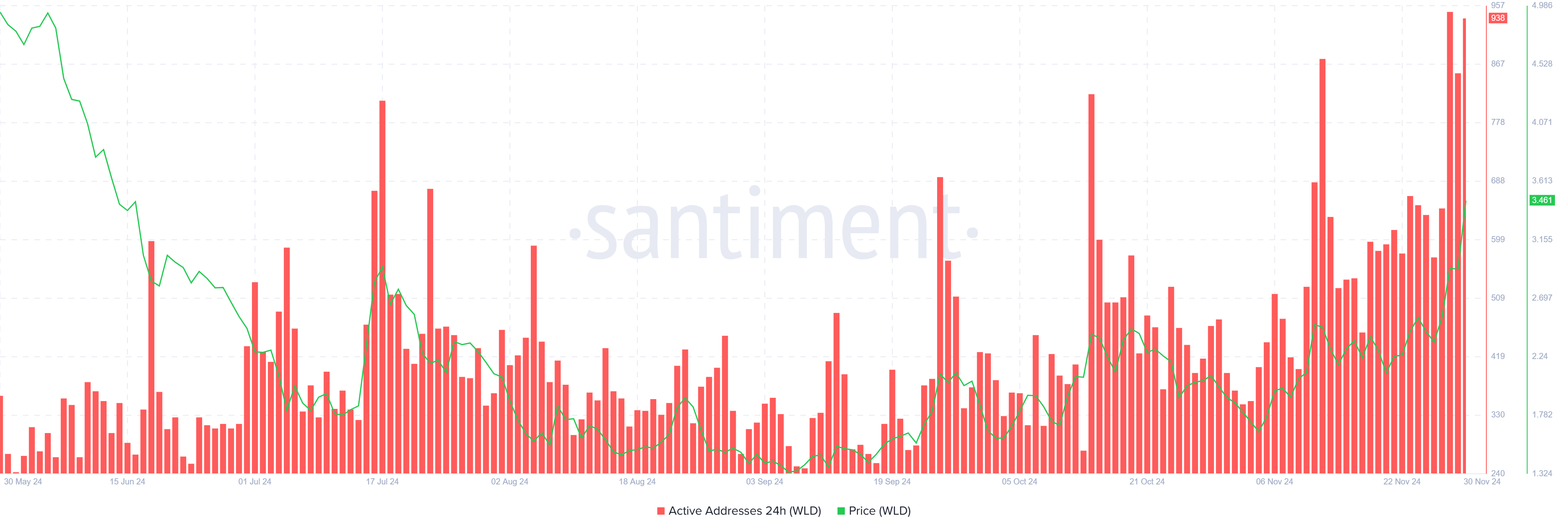 Momentum makro Worldcoin nampaknya menjanjikan, dengan alamat aktif saat ini mencapai level tertinggi dalam enam bulan. Lonjakan partisipasi aktif ini menunjukkan bahwa minat investor terhadap proyek ini sedang meningkat. Aktivitas dan keterlibatan yang meningkat di jaringan sering kali menjadi indikasi permintaan yang tumbuh, yang telah menjadi salah satu pendorong utama apresiasi harga WLD baru-baru ini.