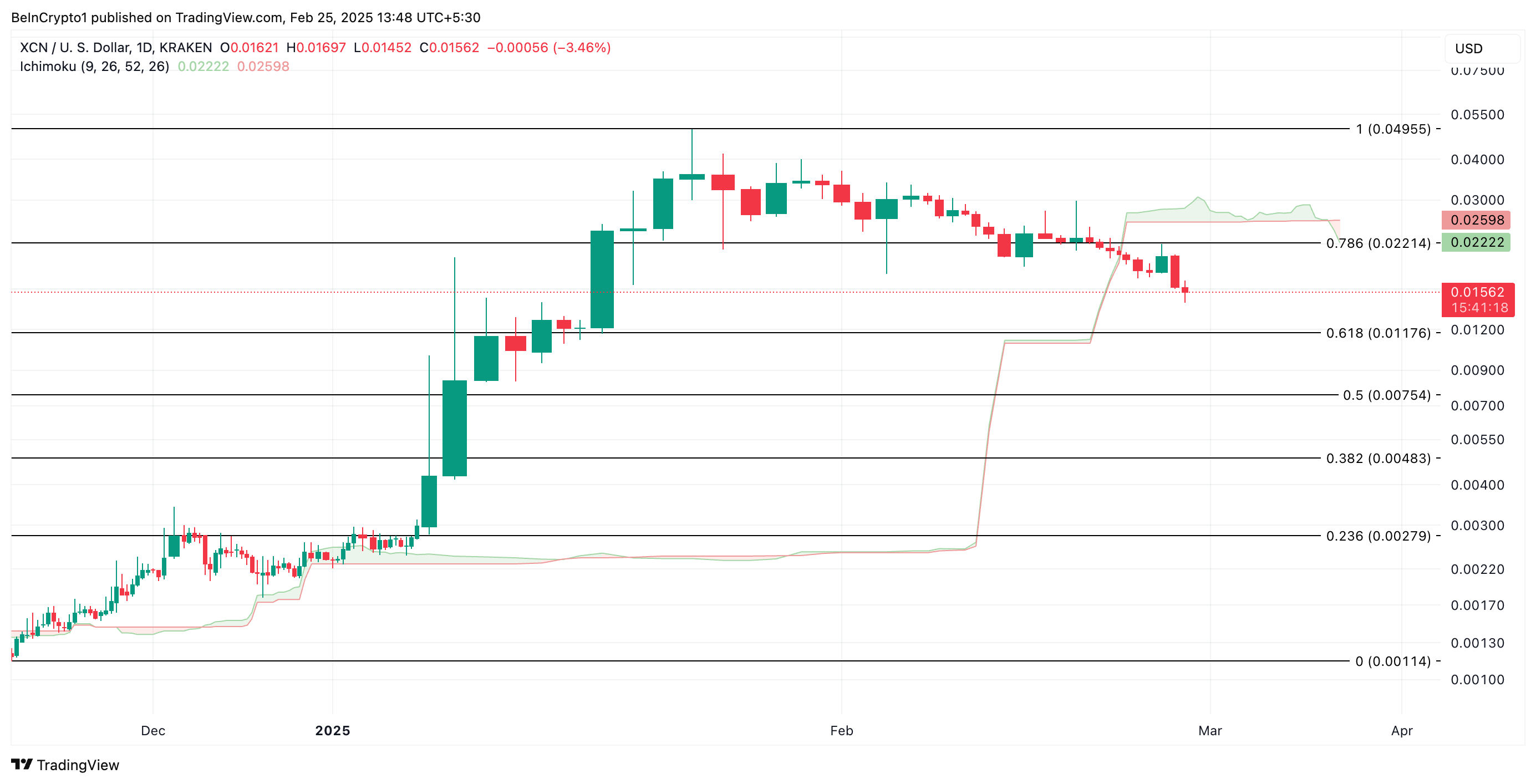 Pada grafik harian, XCN diperdagangkan di bawah Leading Spans A dan B dari indikator Ichimoku Cloud-nya. Indikator momentum ini mengukur tren pasar suatu aset dan mengidentifikasi level support/resistance potensial. Ketika suatu aset jatuh di bawah awan ini, pasar berada dalam tren turun.