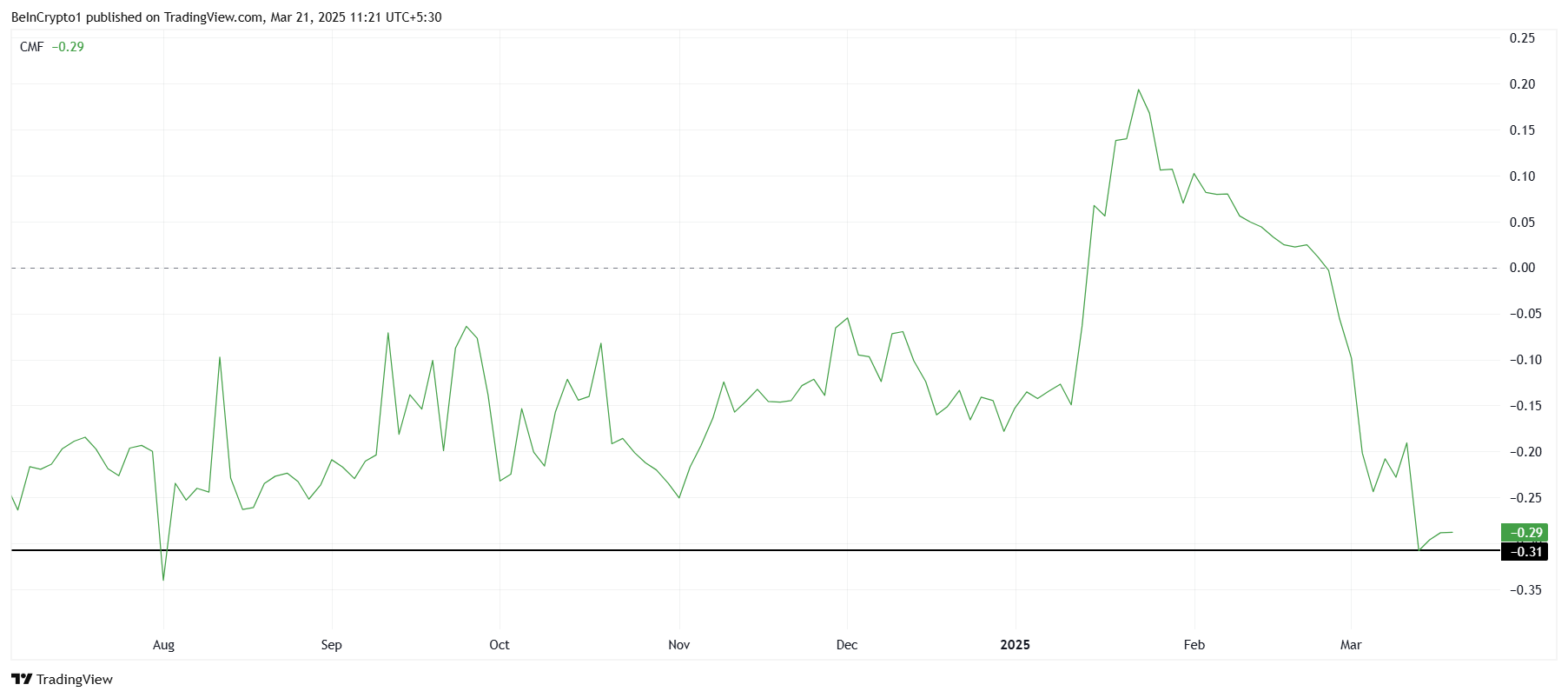 Indikator Chaikin Money Flow (CMF) menunjukkan bahwa Onyxcoin mengalami peningkatan arus keluar selama beberapa minggu terakhir, dengan kenaikan arus keluar terbesar mencapai titik tertinggi dalam 7 bulan. Ini menunjukkan bahwa holder XCN semakin berhati-hati, menarik dana karena kehilangan kepercayaan pada prospek jangka pendek aset kripto ini.