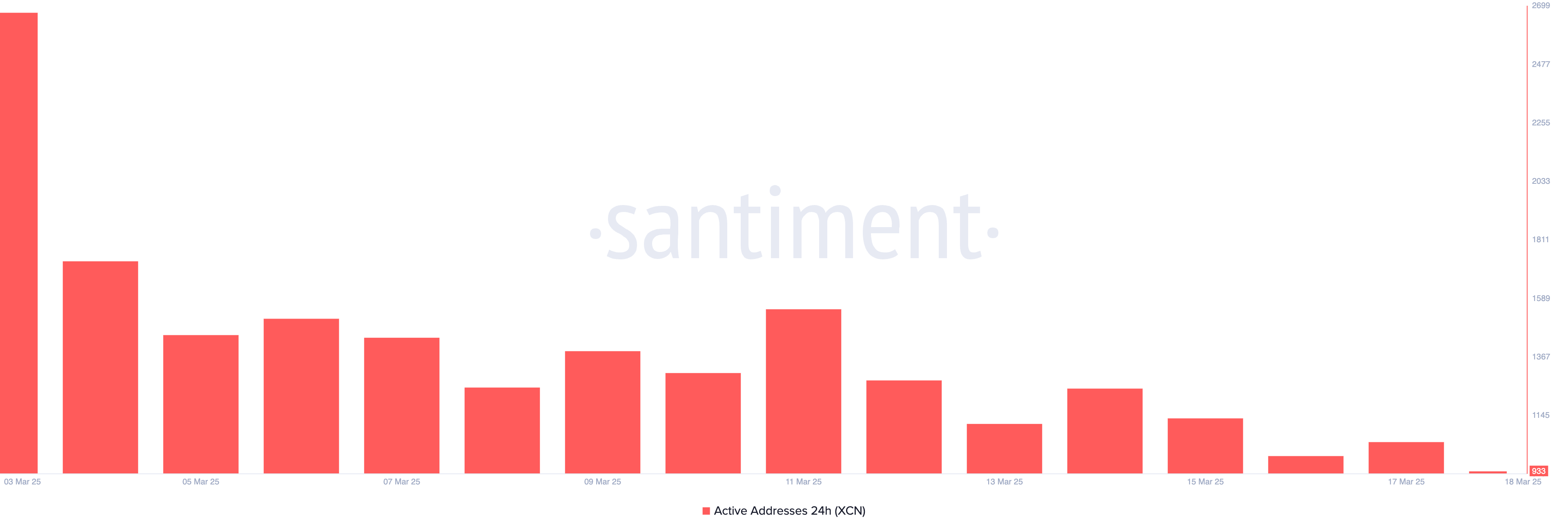 Menurut penyedia data on-chain, pada 3 Maret, 2.673 alamat unik menyelesaikan setidaknya satu transaksi yang melibatkan XCN. Sejak itu, angka ini terus menurun, mencapai titik terendah 1.044 pada 18 Maret.