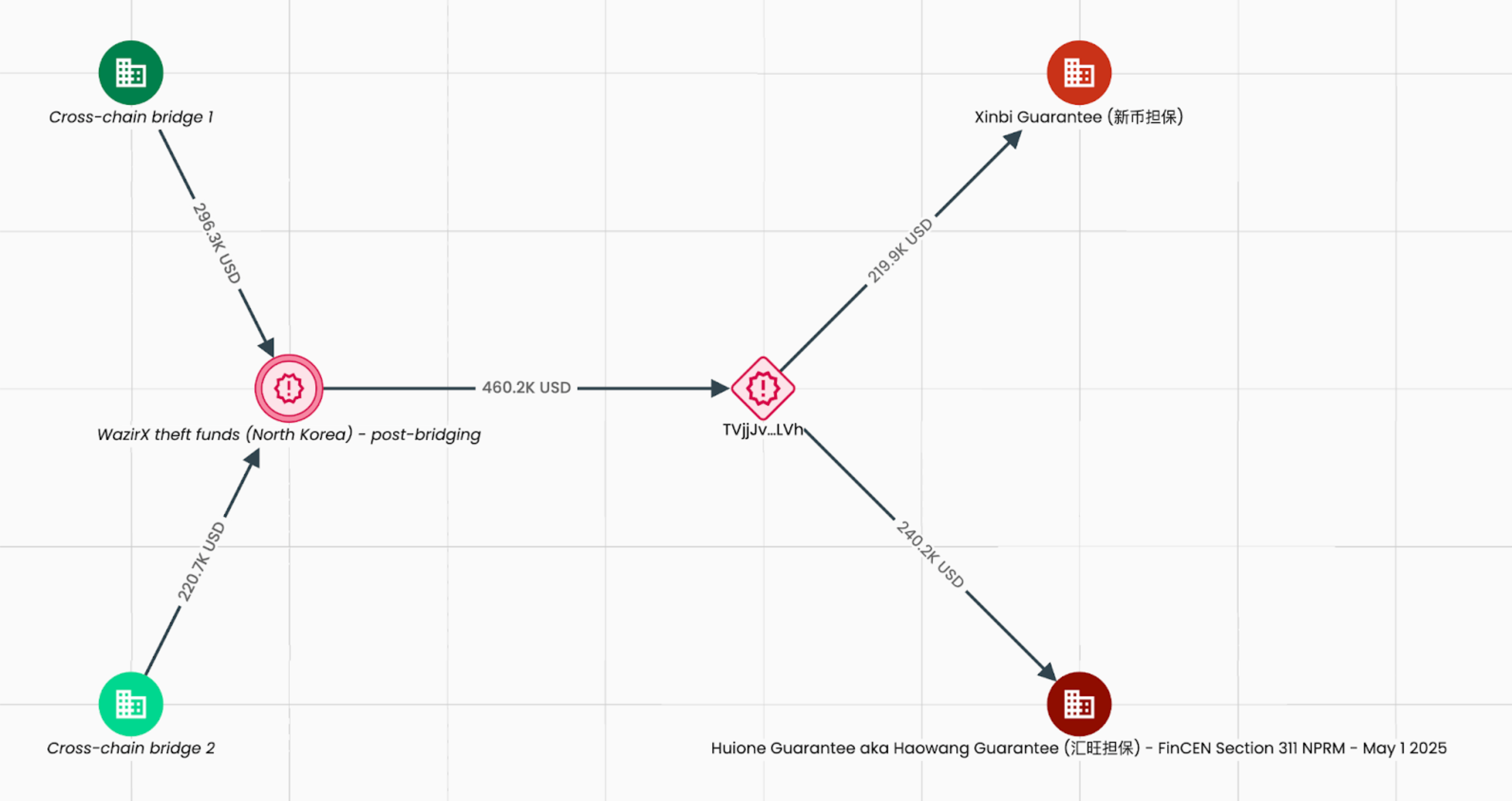 Operator saluran ini mencuci hasil dari penipuan dan bahkan penipuan pig butchering. Selain itu, Xinbi Guarantee juga mencuci aset kripto yang peretas Korea Utara curi dari WazirX. Pada Juli 2024, exchange India tersebut mengalami peretasan senilai US$235 juta.