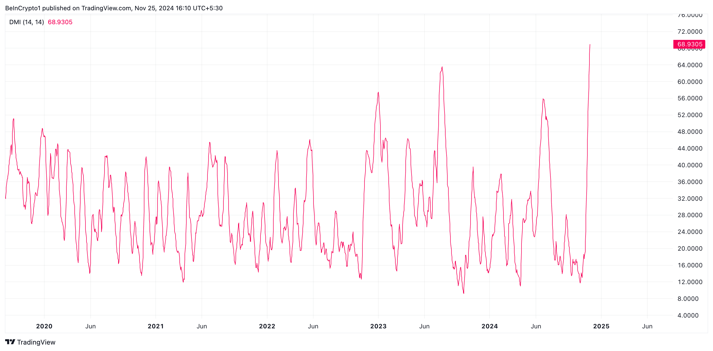 ADX mengukur kekuatan tren pasar, berkisar dari 0 hingga 100. Pembacaan ADX sebesar 68 menunjukkan tren naik yang sangat kuat. Nilai tinggi ini menunjukkan bahwa tren XLM saat ini kemungkinan akan berlanjut.
