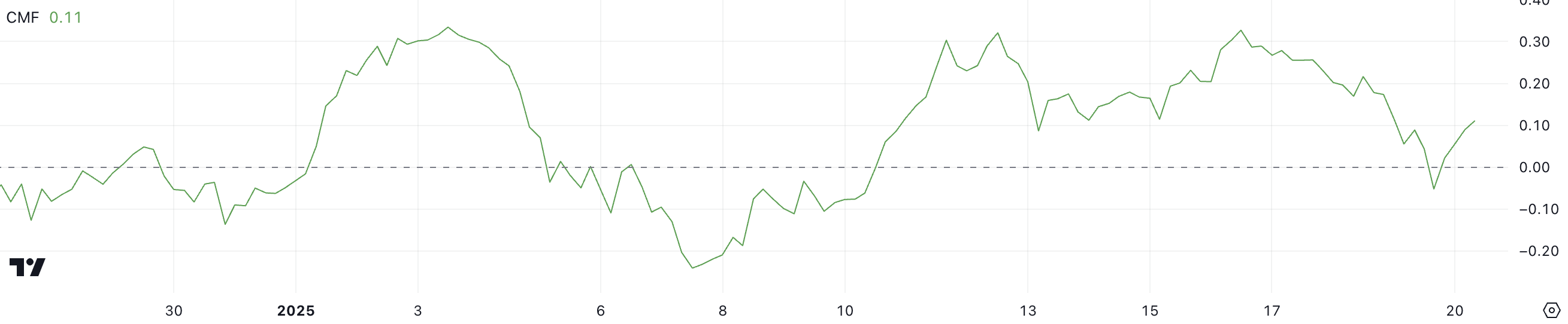 XRP Chaikin Money Flow (CMF) saat ini berada di 0,11, bangkit dari penurunan baru-baru ini ke -0,05 hanya sehari yang lalu. Ini mengikuti sembilan hari berturut-turut pembacaan CMF positif, yang mencapai puncaknya di 0,33 ketika harga XRP mencapai level tertinggi baru sepanjang masa.