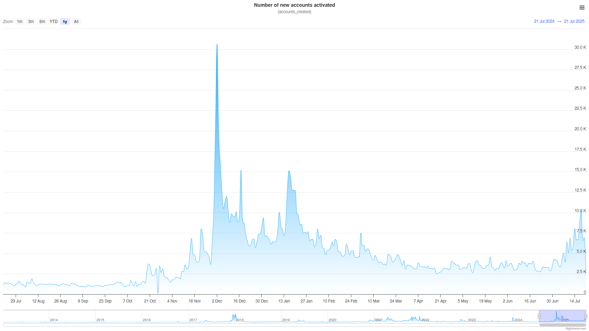 Tanda pertama dan paling jelas dari pertumbuhan XRP adalah jumlah akun baru yang diaktifkan di XRPL. Menurut data dari XRPScan, jumlah akun baru melampaui 10.000 pada 18 Juli, menandai total harian tertinggi sejak Februari.