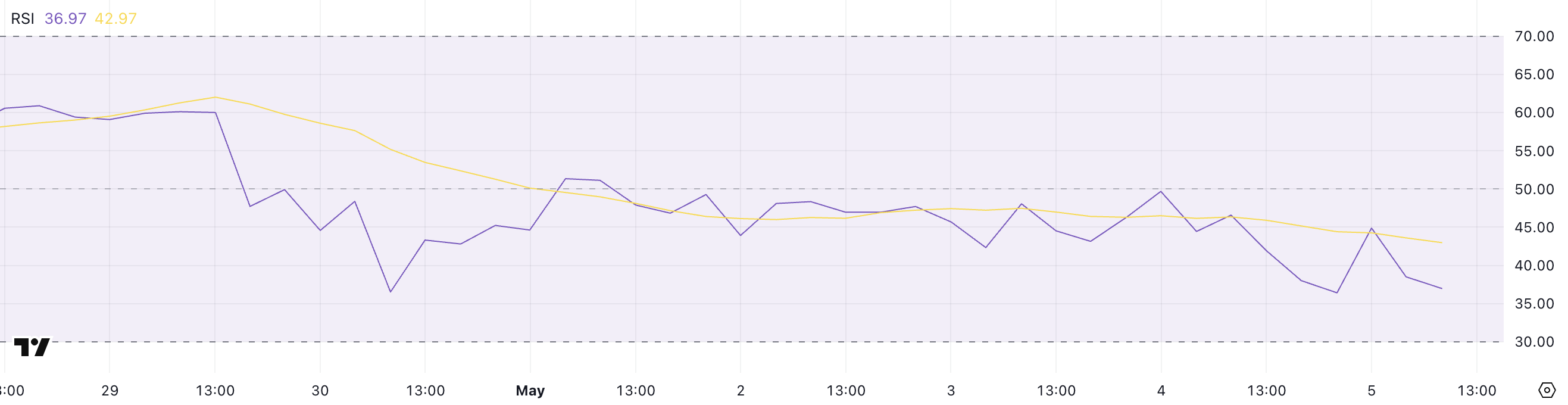 Bacaan di atas 70 biasanya menunjukkan aset overbought dan mungkin menghadapi koreksi, sementara bacaan di bawah 30 menunjukkan mungkin oversold dan siap untuk bangkit.