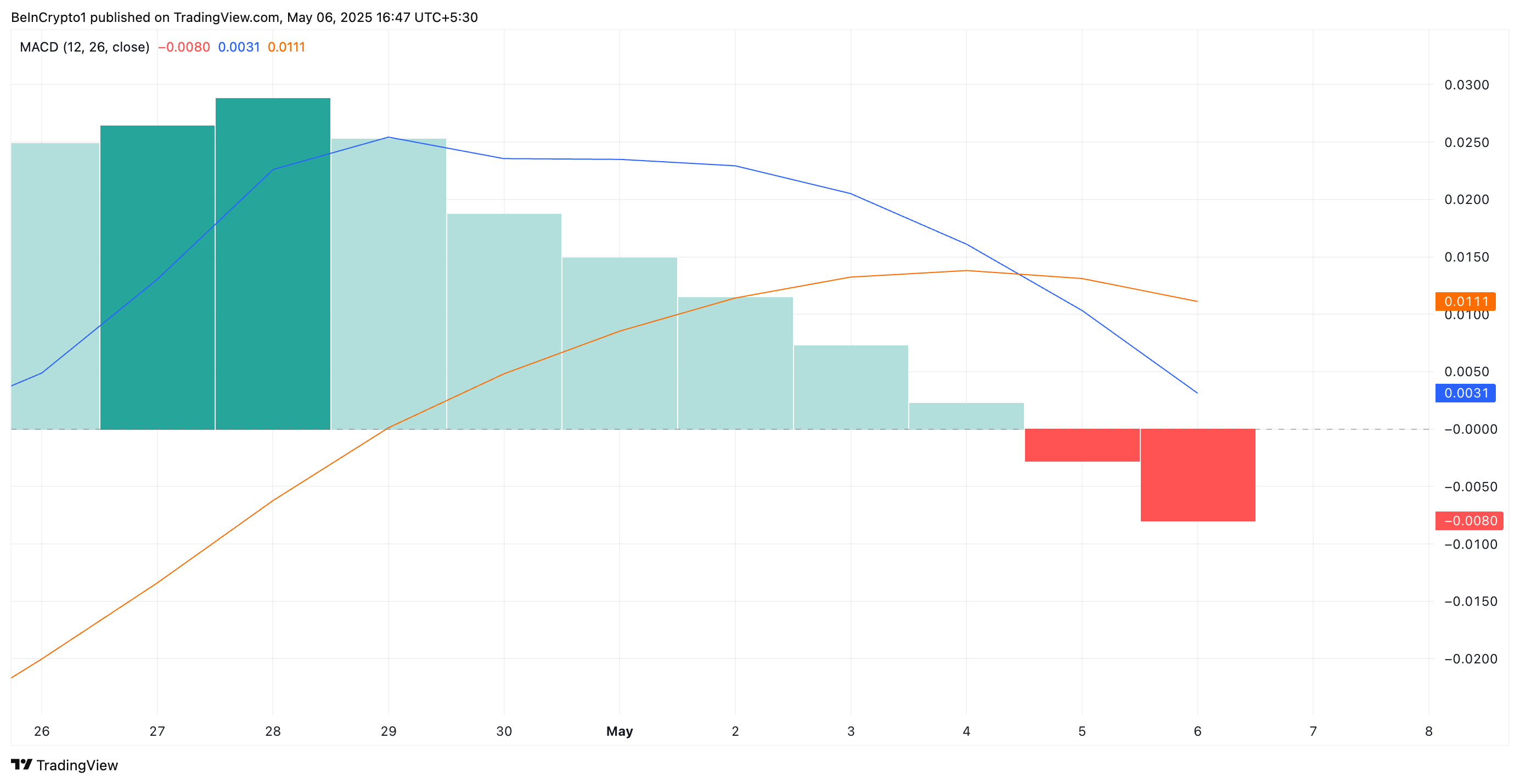 Pada grafik harian, “death cross” yang baru terbentuk oleh indikator Moving Average Convergence Divergence (MACD) XRP mendukung pandangan bearish ini. Pembacaan dari grafik satu hari XRP/USD mengungkapkan bahwa garis MACD (biru) XRP ditutup di bawah garis sinyalnya (oranye) pada hari Senin, membentuk death cross.