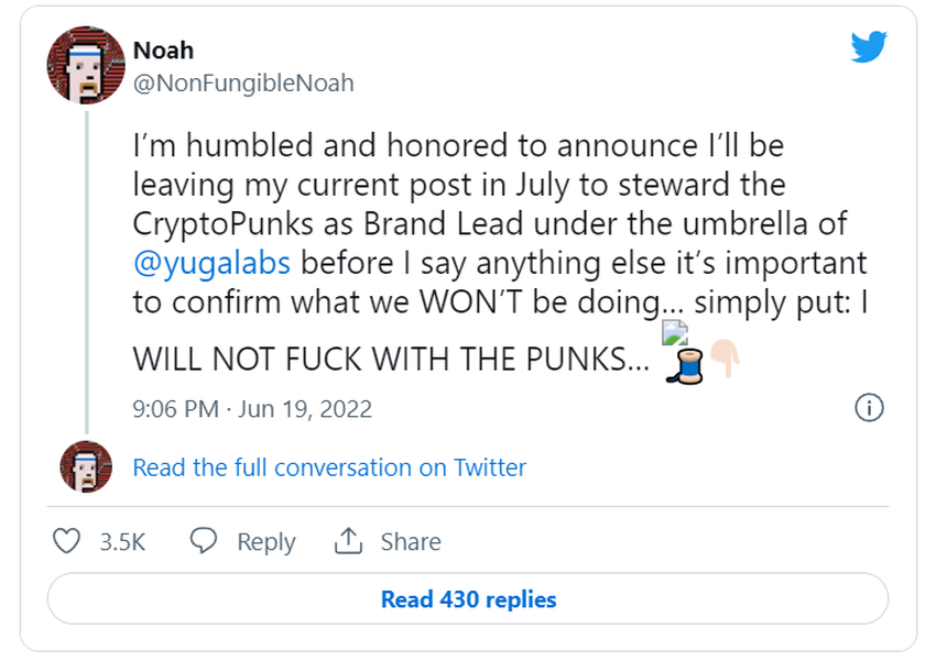 Kemudian, pada keesokan harinya (19/06), Direktur Penjualan Digital di Christie’s, yaitu Noah Davis, menuliskan sebuah cuitan bahwa ia akan meninggalkan Christie’s untuk bergabung dengan CryptoPunks sebagai “Brand Lead”.