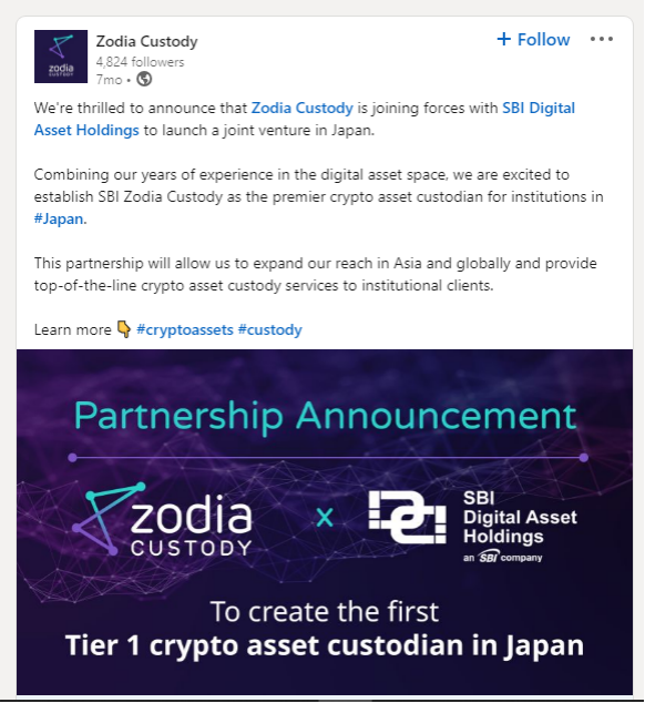 Di samping itu, pada Februari lalu, Zodia juga sudah menggandeng kerja sama dengan SBI Digital Asset Holding untuk membentuk perusahaan patungan yang dinamakan SBI Zodia Custody. Kerja sama itu bertujuan untuk menyediakan layanan kustodian kripto bagi nasabah institusi di Jepang.